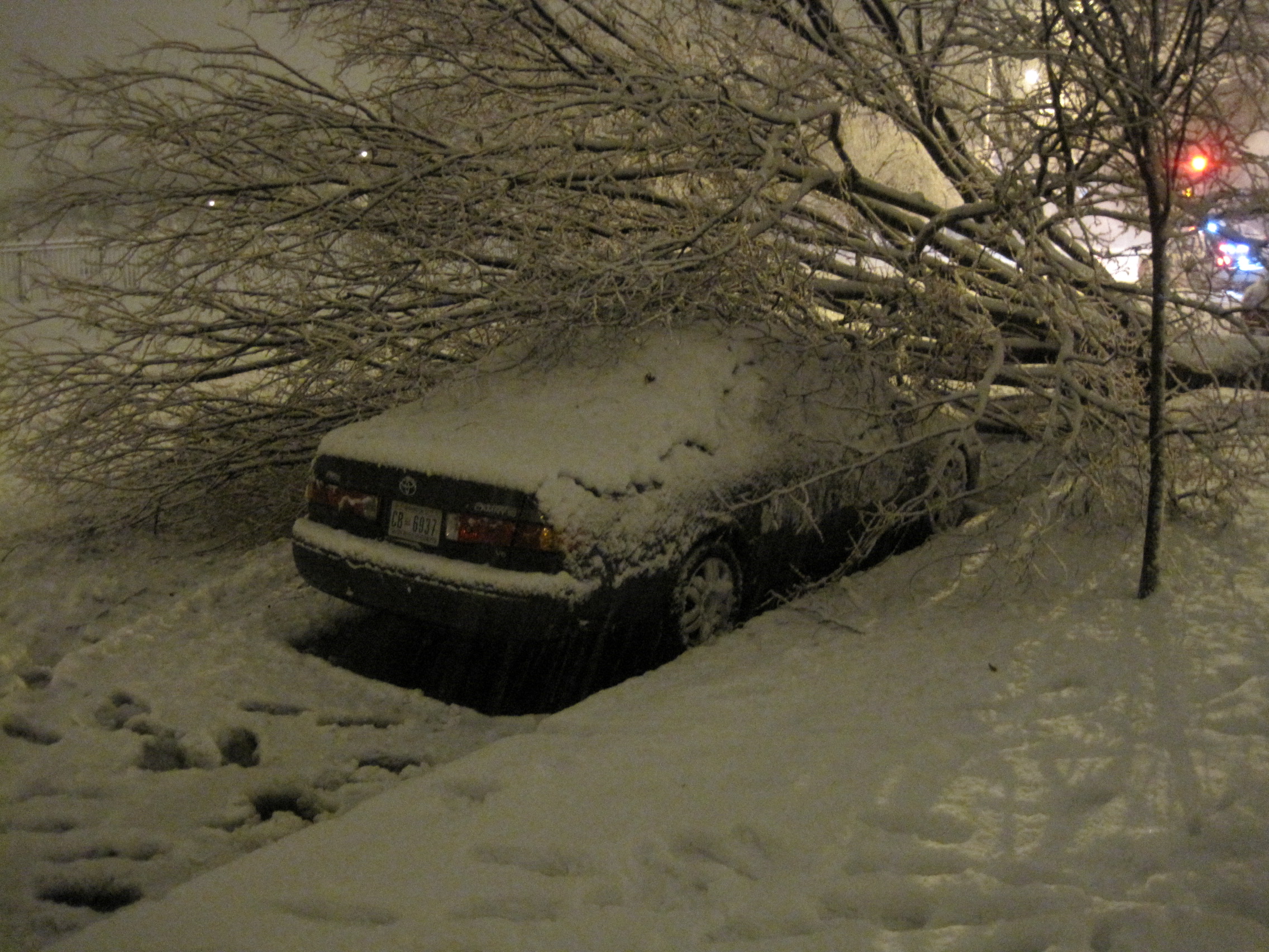 The heavy, wet snow caused the tree to collapse. Fortunately, no one was injured and no other cars were hit. The city came on Thursday morning and chopped up the tree. Amazingly, my car only had minimal damage (no cracked windshield or dents).