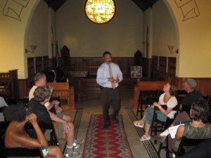 DC DPW Dir. William Howland answers questions at the July 20 neighborhood outreach meeting at Congressional Cemetery. DPW is providing trash bags for the Hill Trash Mob.