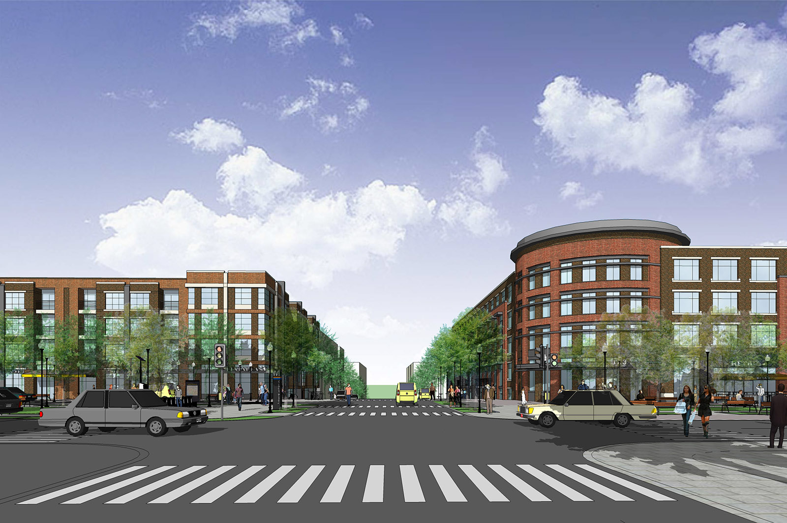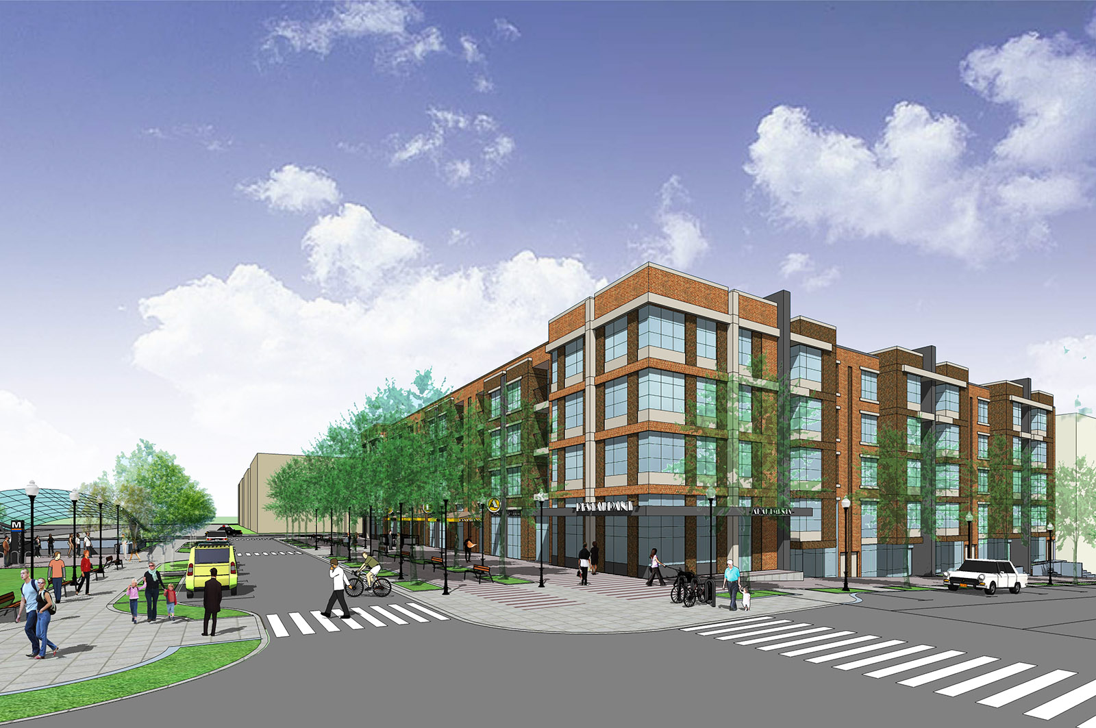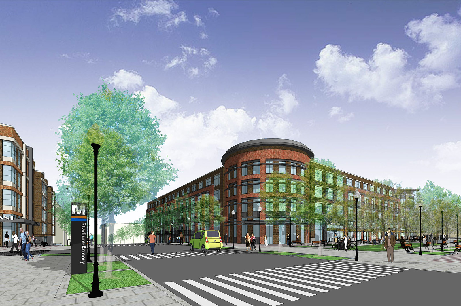 Rendering of North Building, which would be located directly East of the Stadium-Armory Metro Plaza.