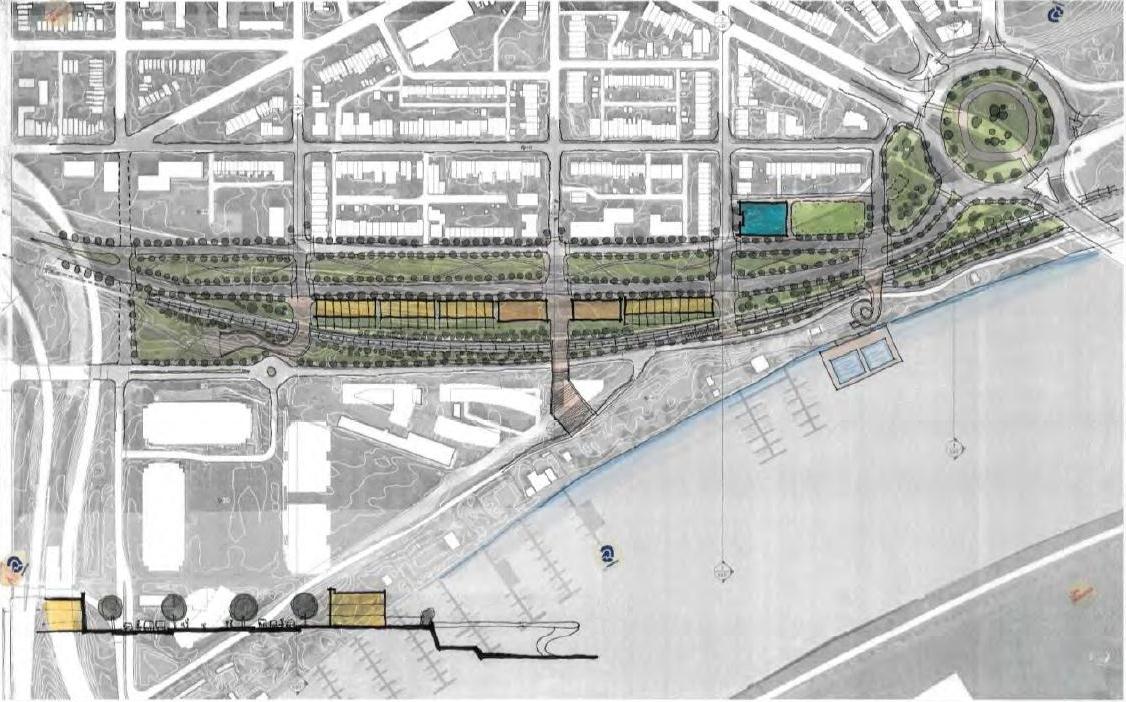 Emerine also shared Concept A2 which extends the grid to two-lane boulevard, with low intensity (rowhouse) development between L Street and the boulevard. This concept envisions 15th Street SE as a potential pedestrian connection to the waterfront with the potential for mixed use development.