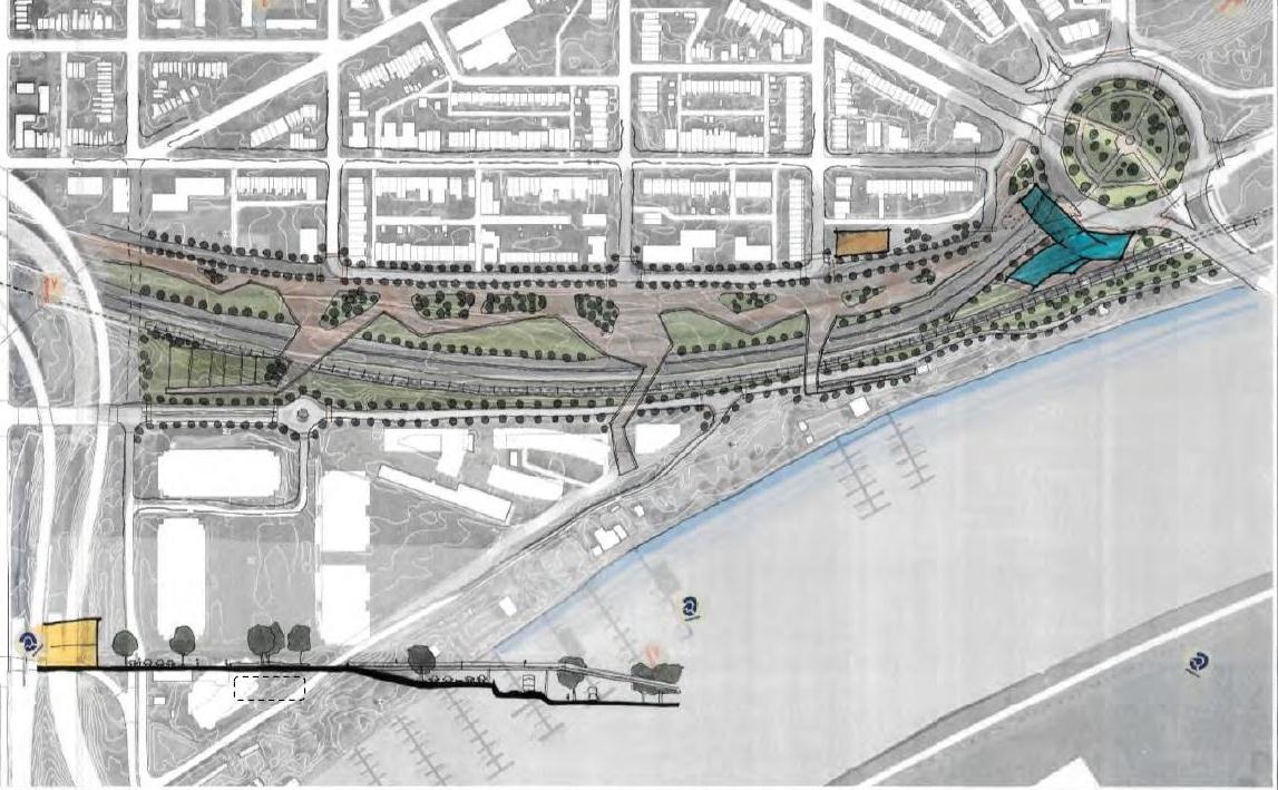 Concept C2 includes no new development. Instead, a linear park would be constructed south of L Street with pedestrian crossings above the four-lane boulevard. There would also be no connections between the existing street grid and boulevard.